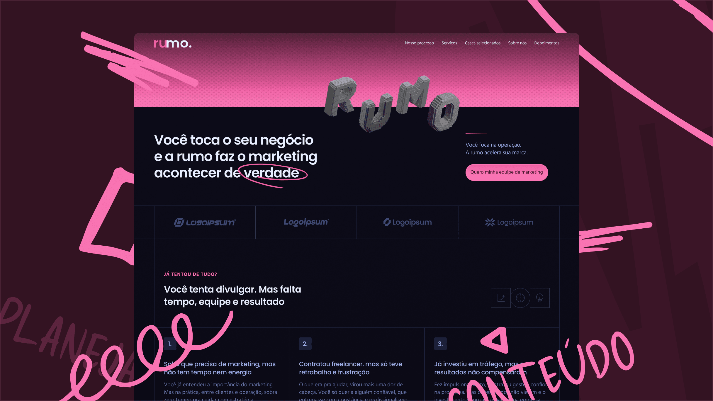 Construção de uma landing page orientada à conversão, pensada para posicionar a Rumo Marketing como referência para negócios locais e transformar tráfego em oportunidades reais.